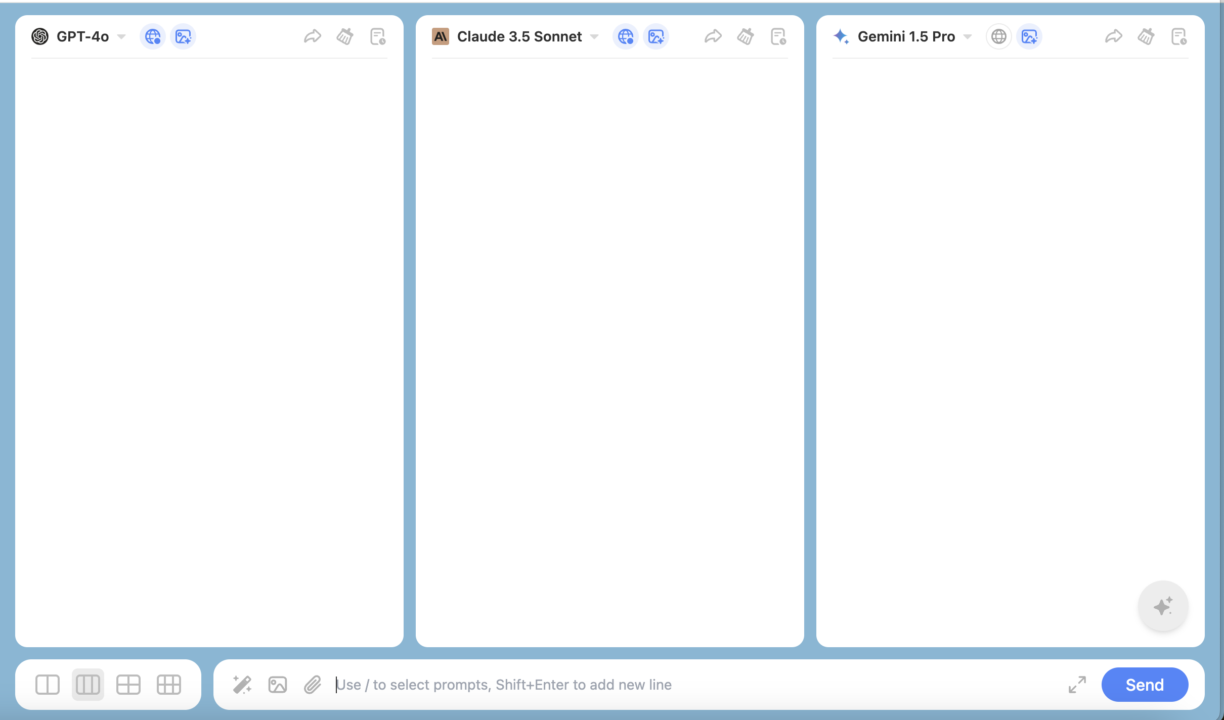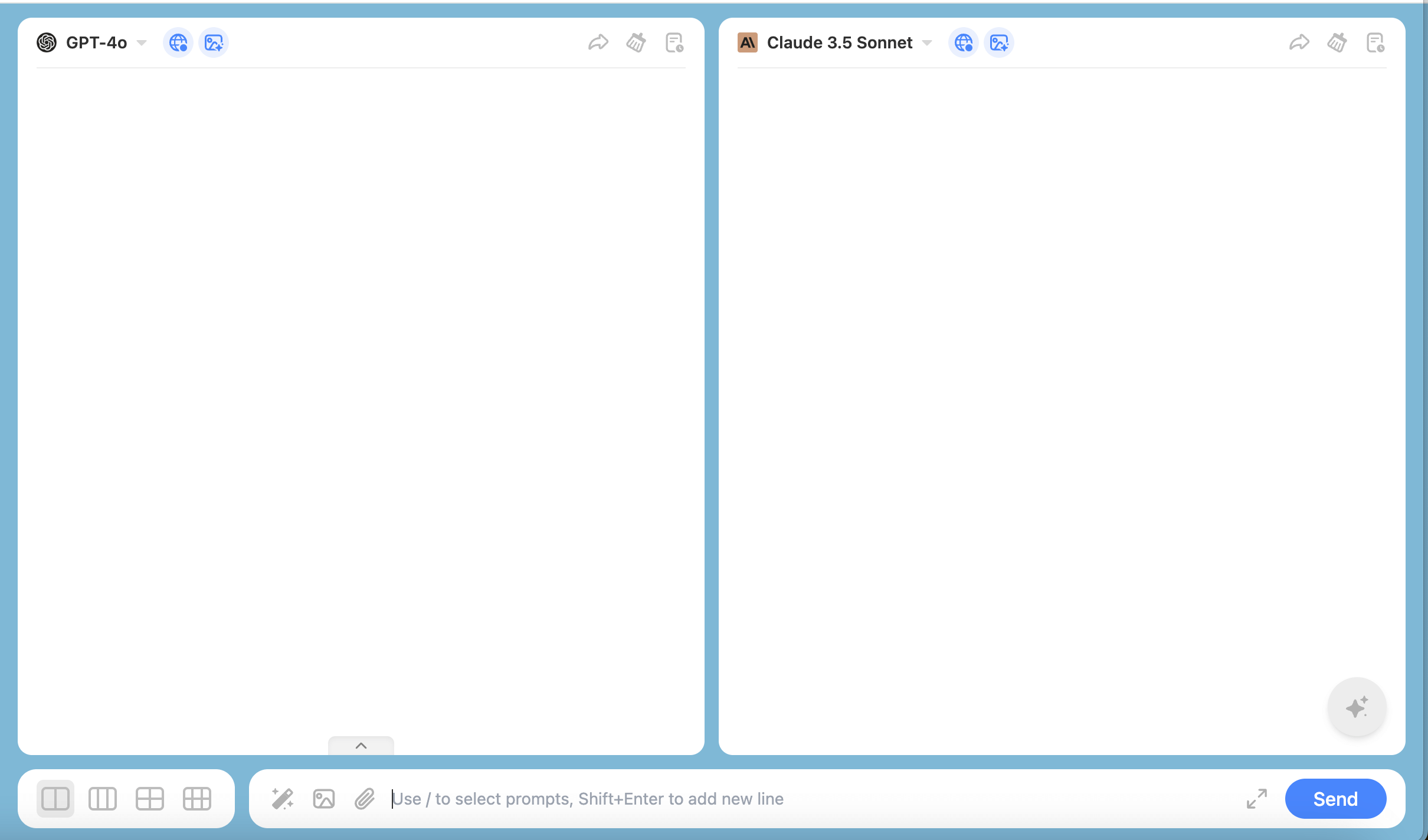 You can choose different large language models and quantities based on your needs, and you can chat with up to six large language models simultaneously.